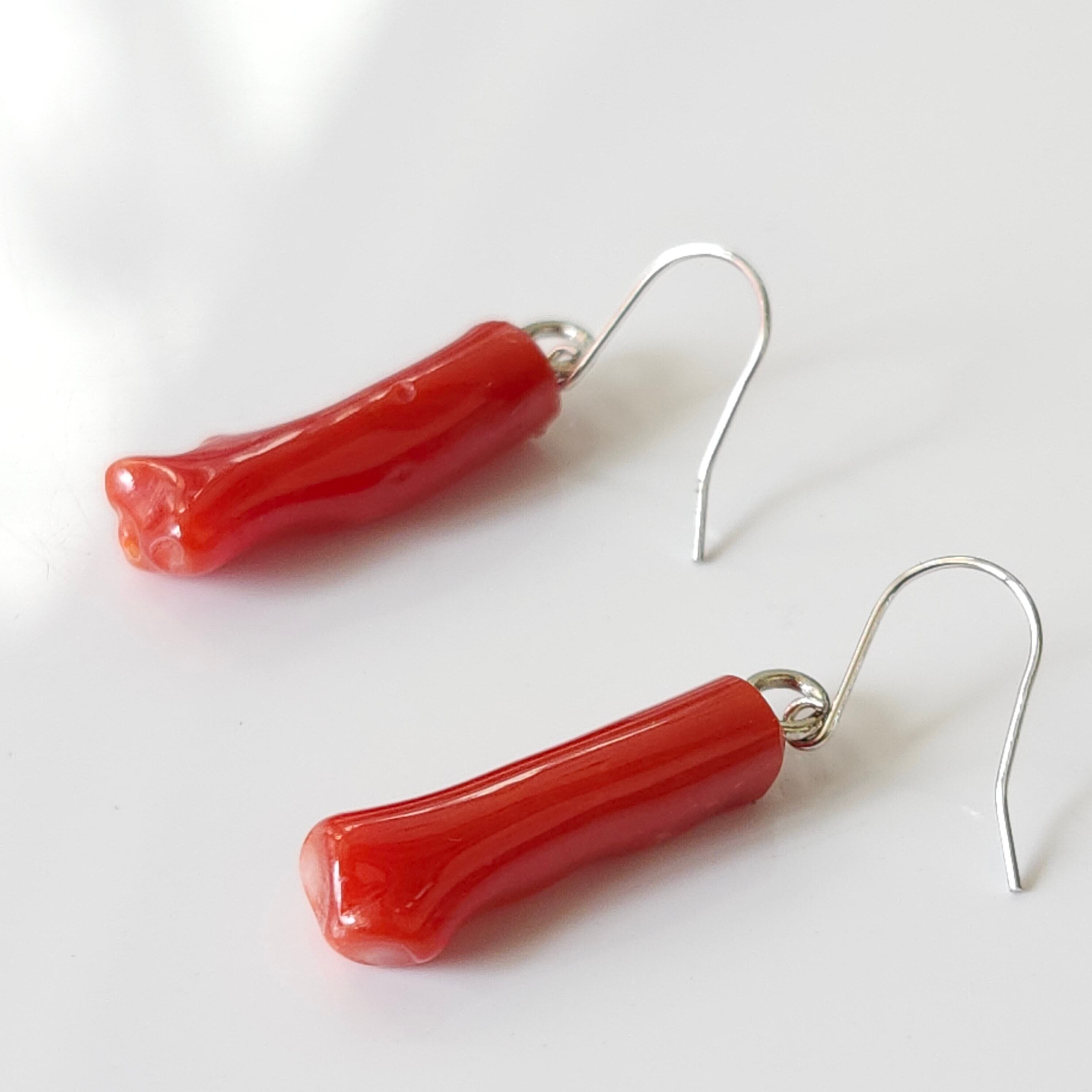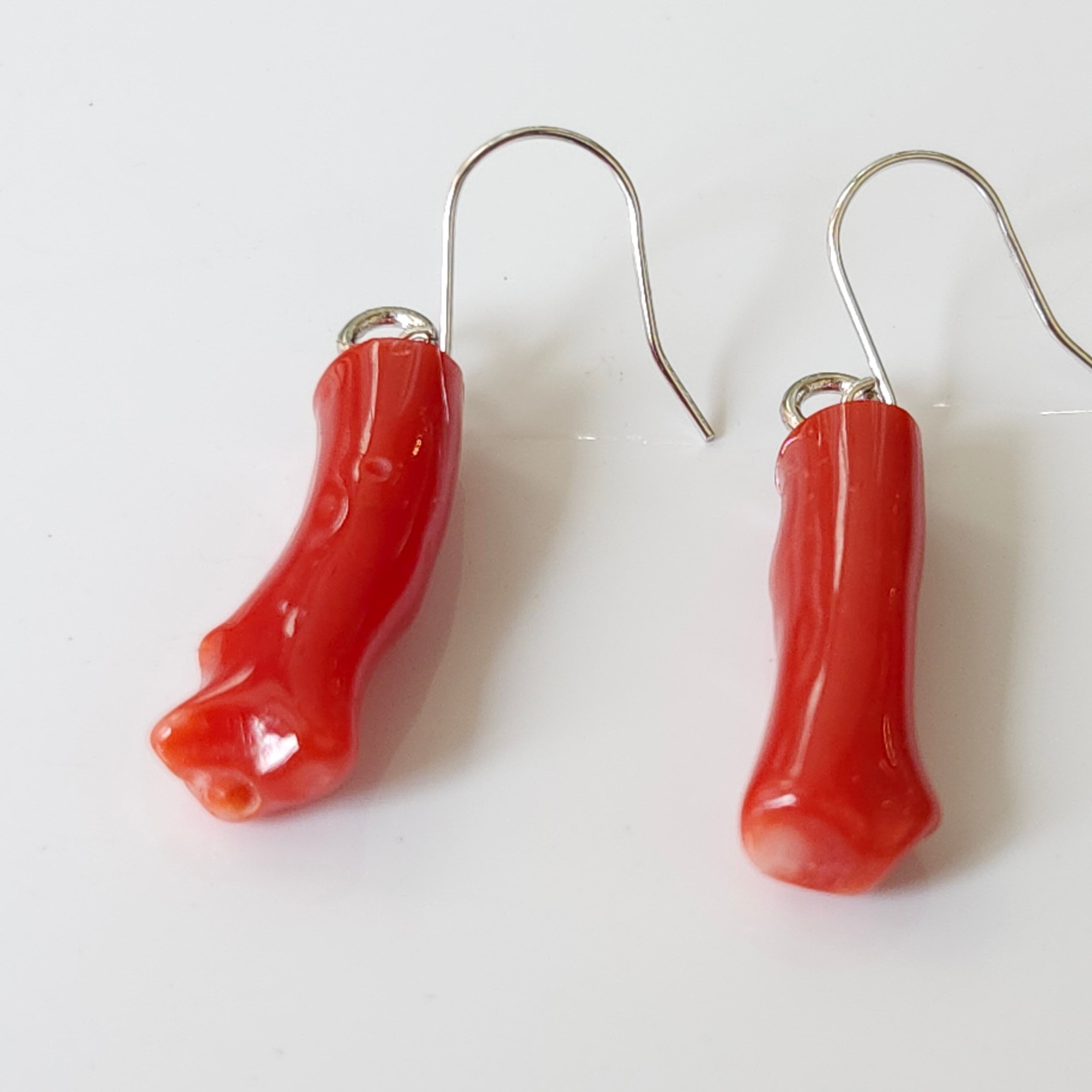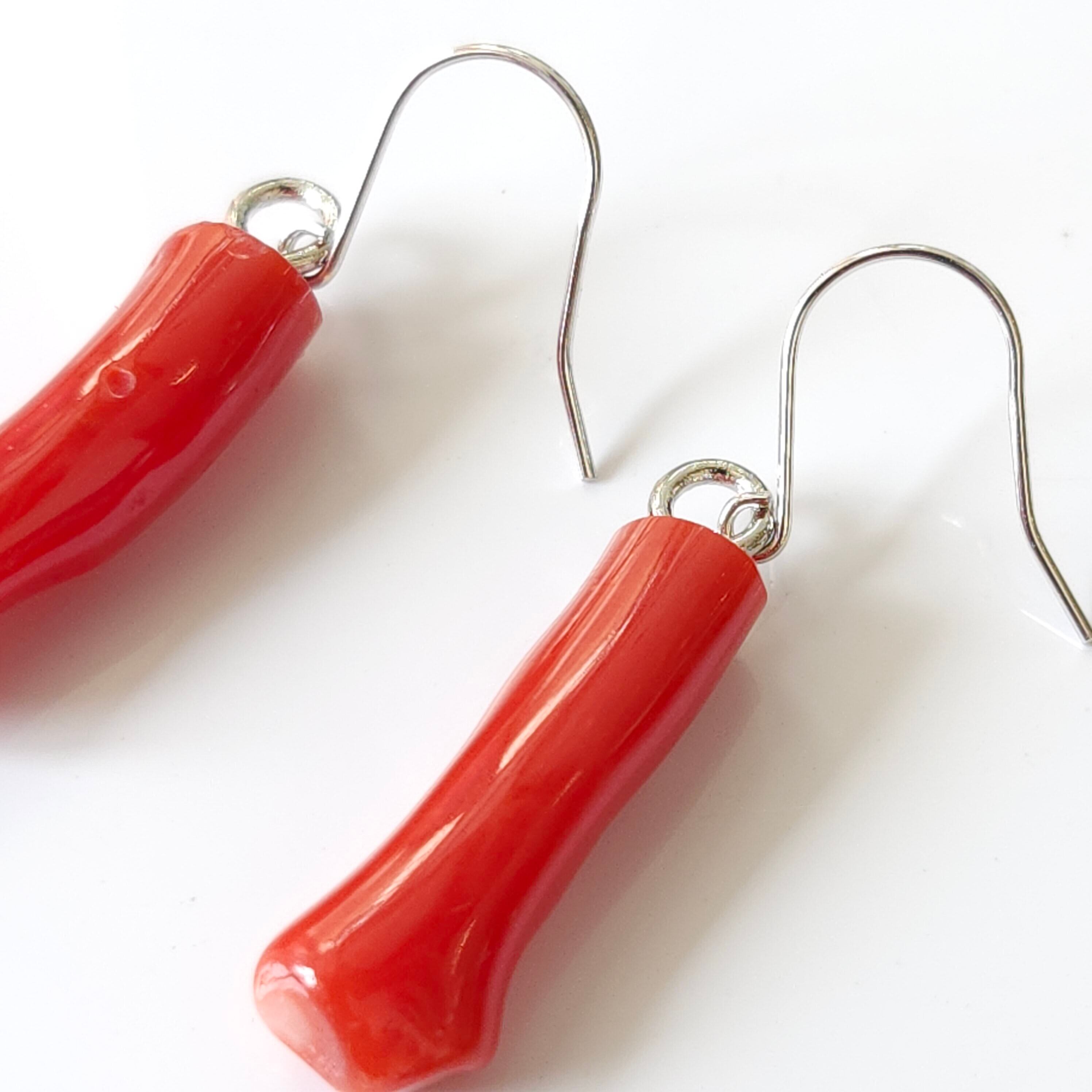 色の濃い赤珊瑚を使用し製作したピアスです。