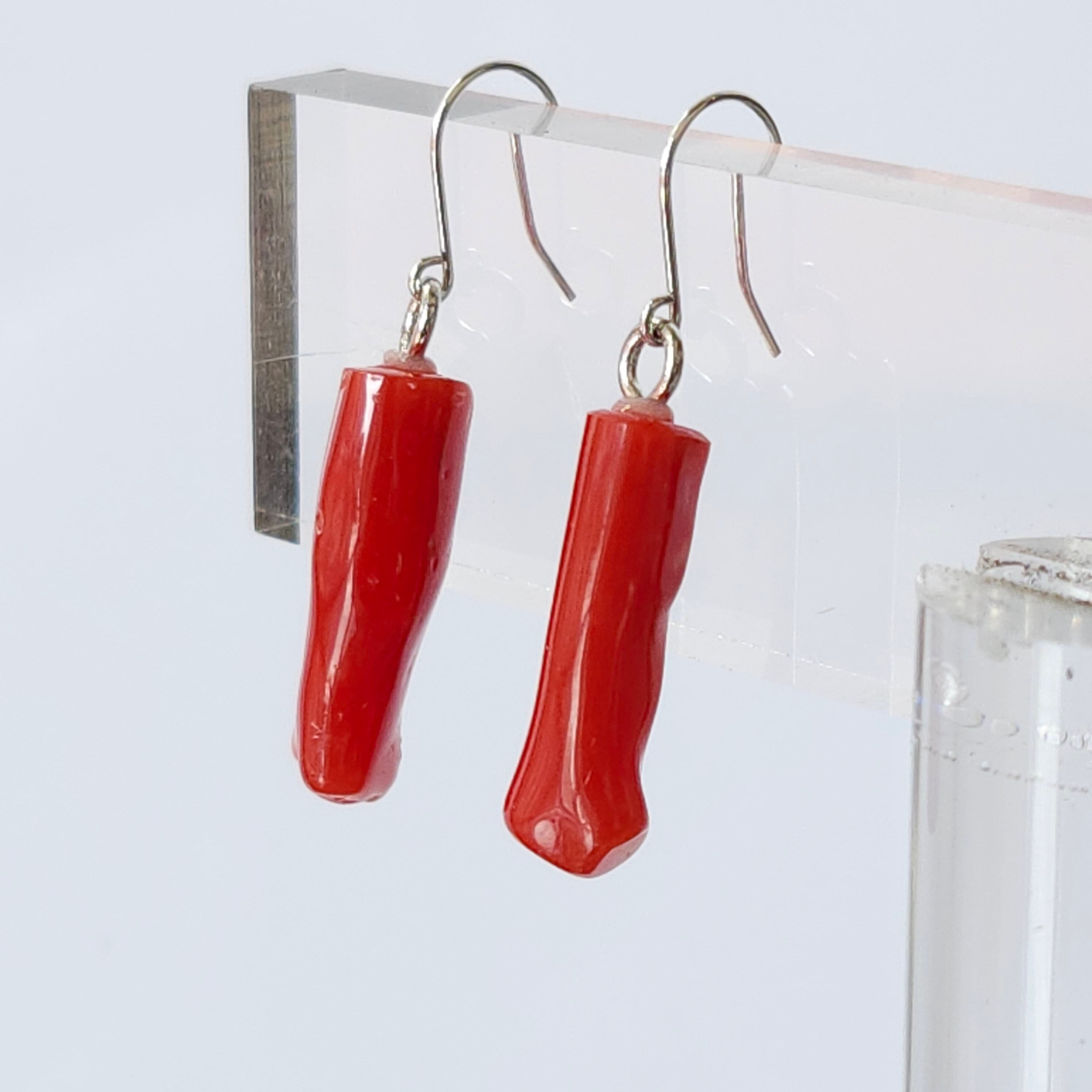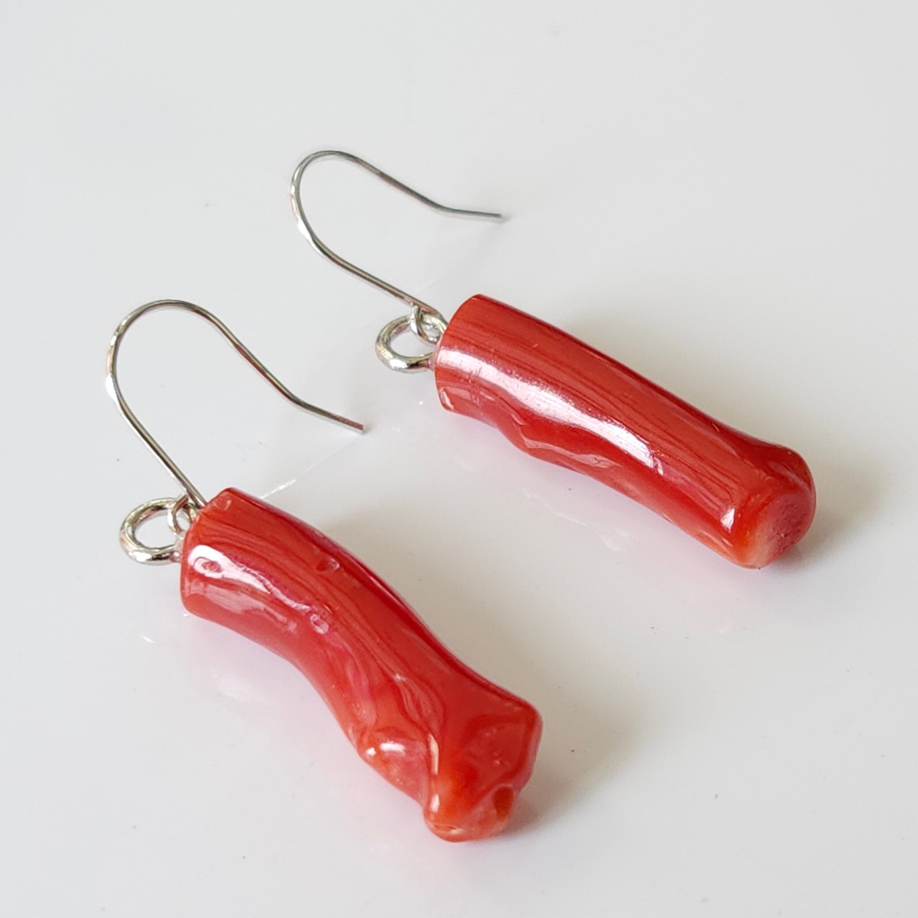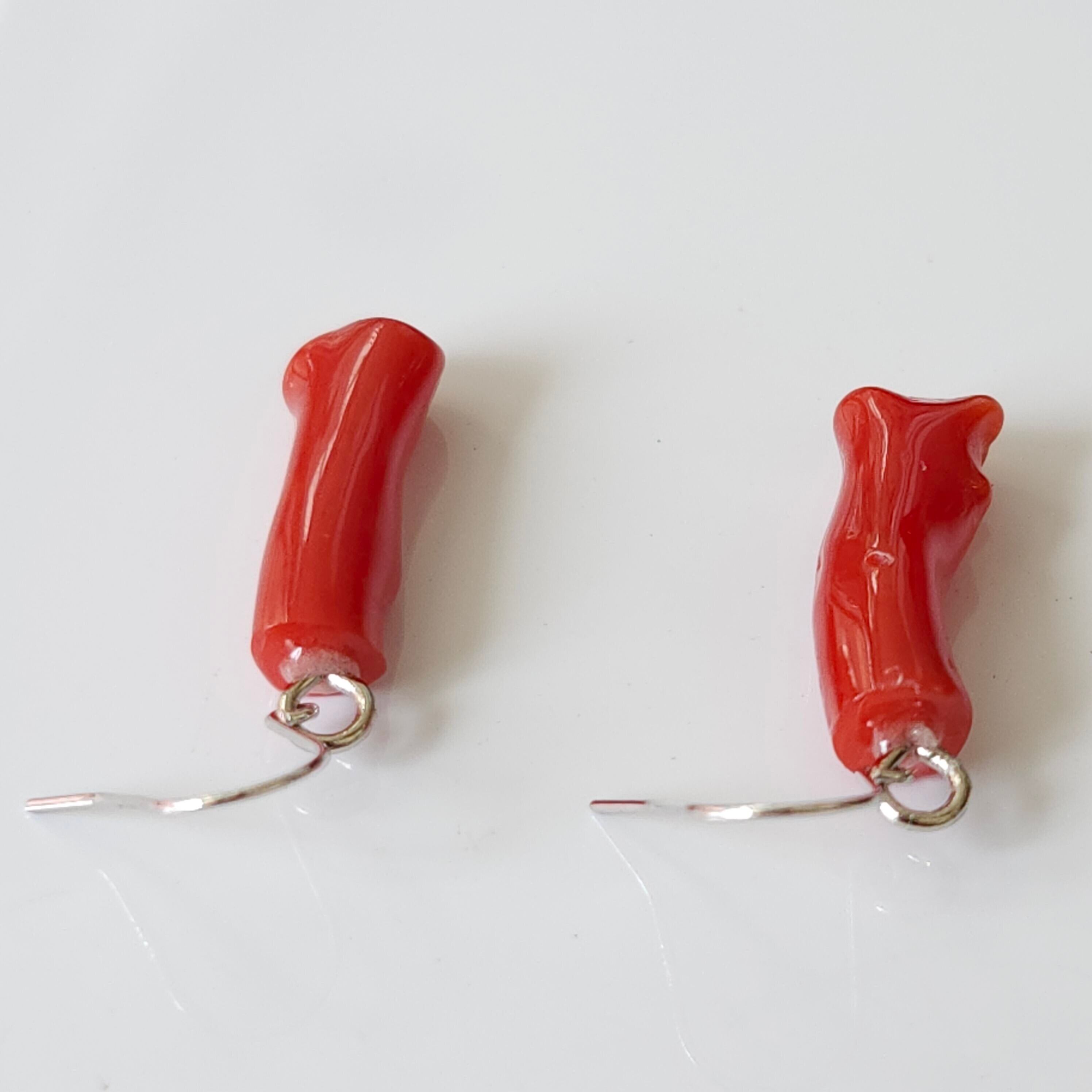 色の濃い赤珊瑚を使用し製作したピアスです。