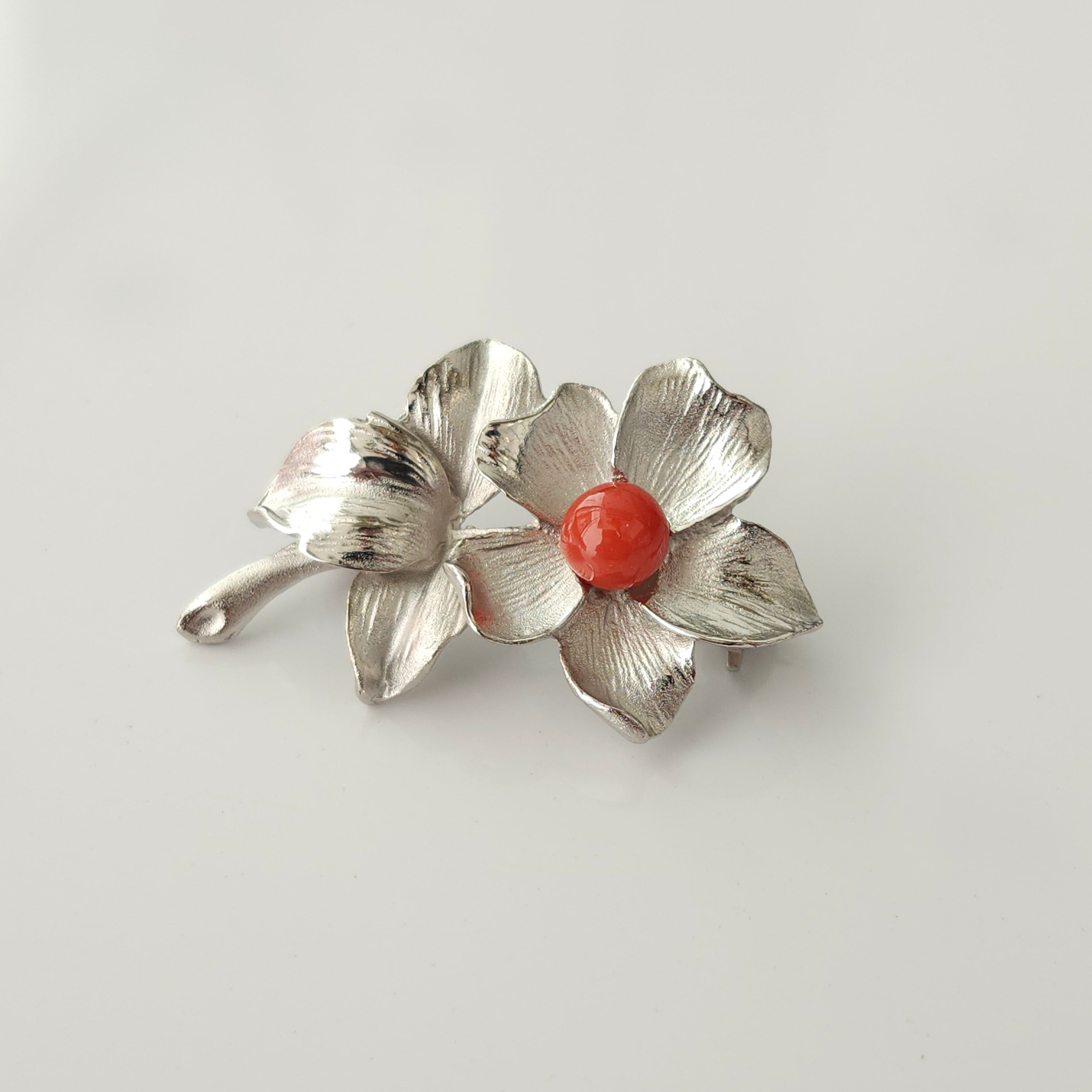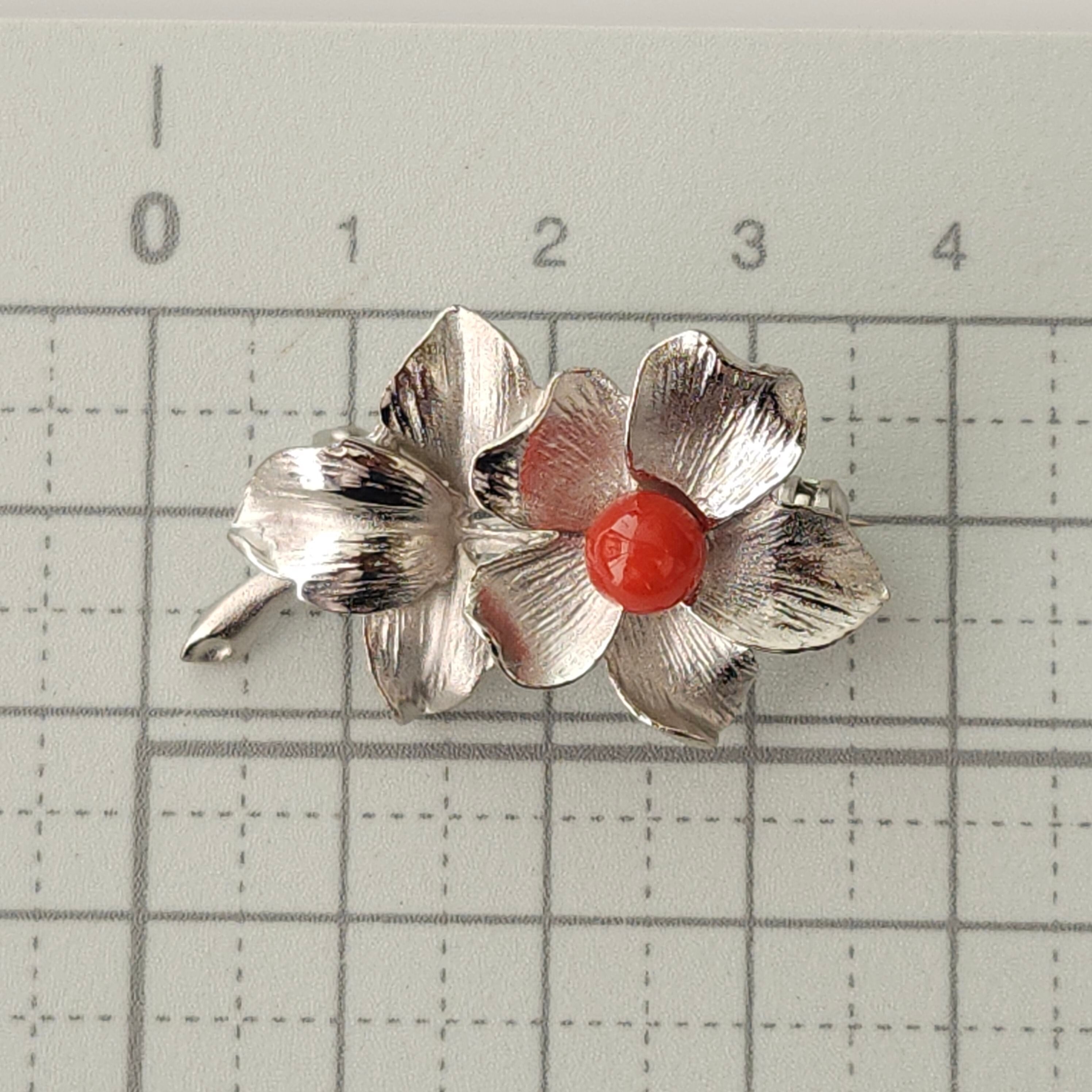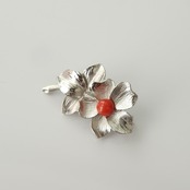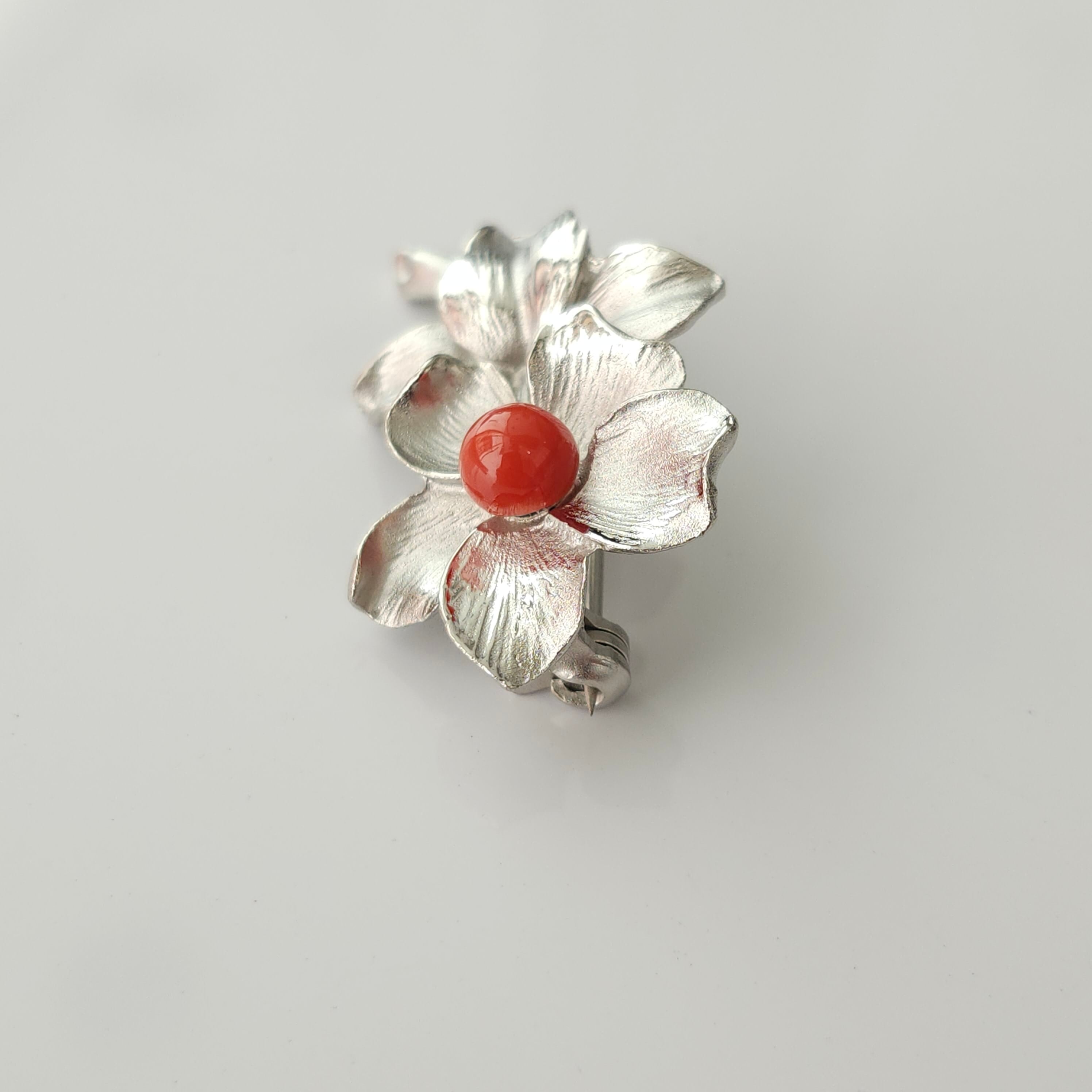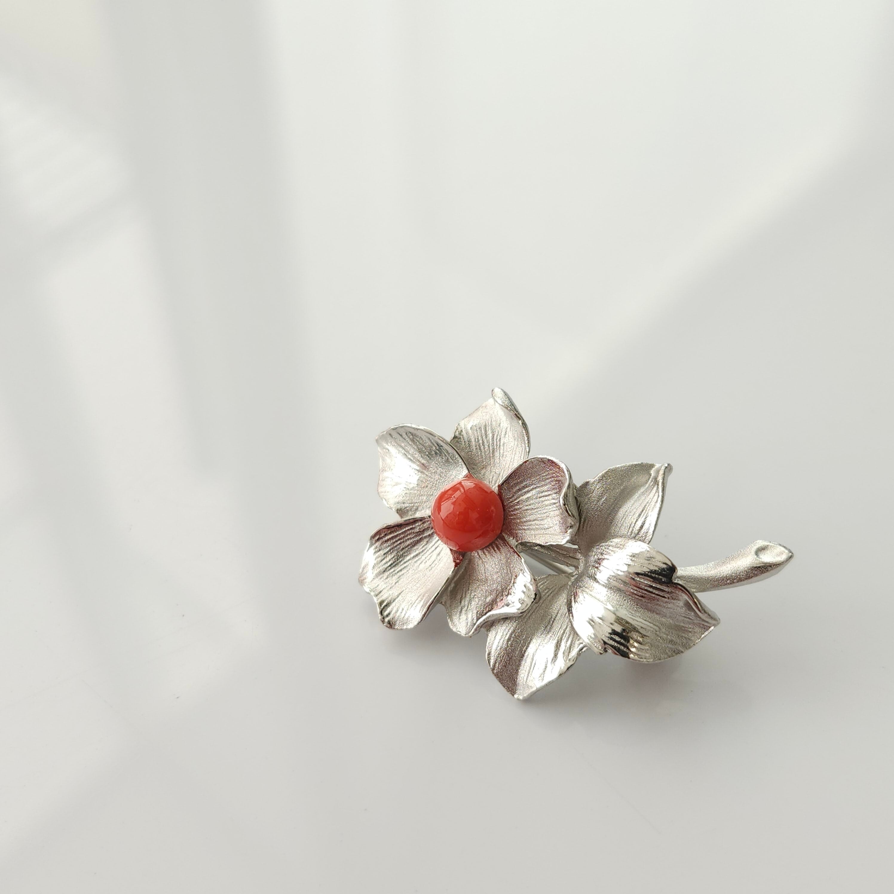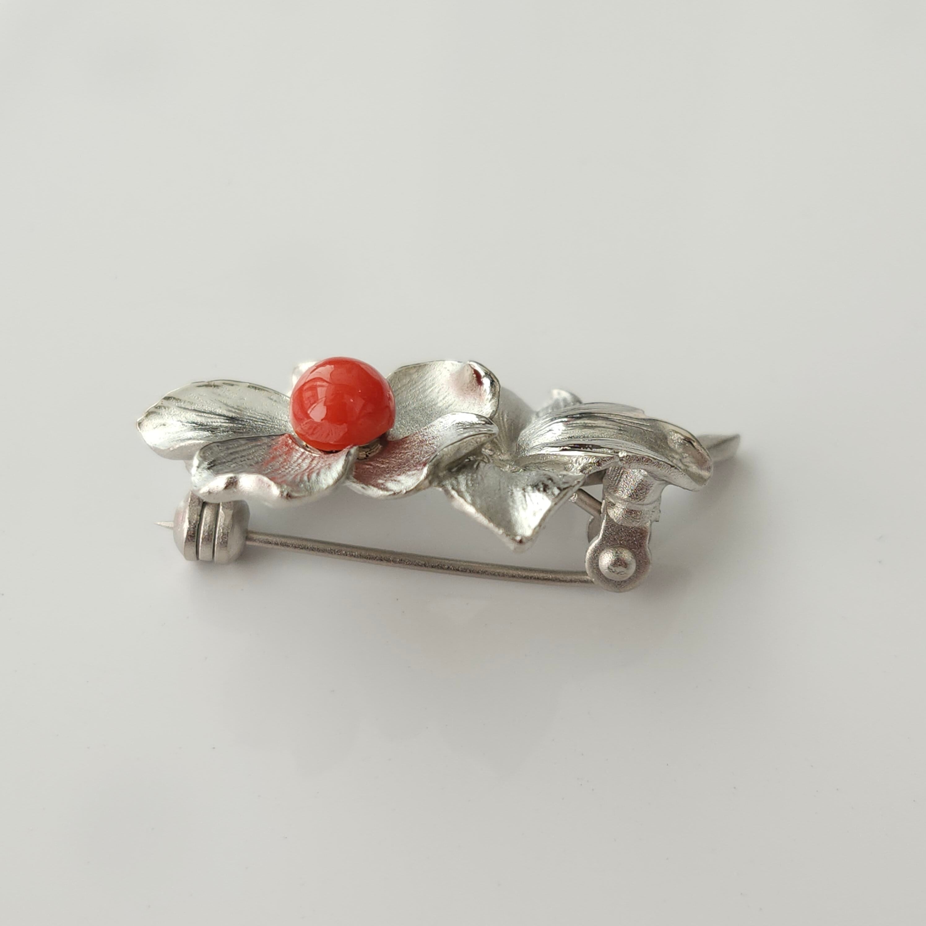 光沢のある銀色の金具に綺麗な赤珊瑚を配したブローチです。