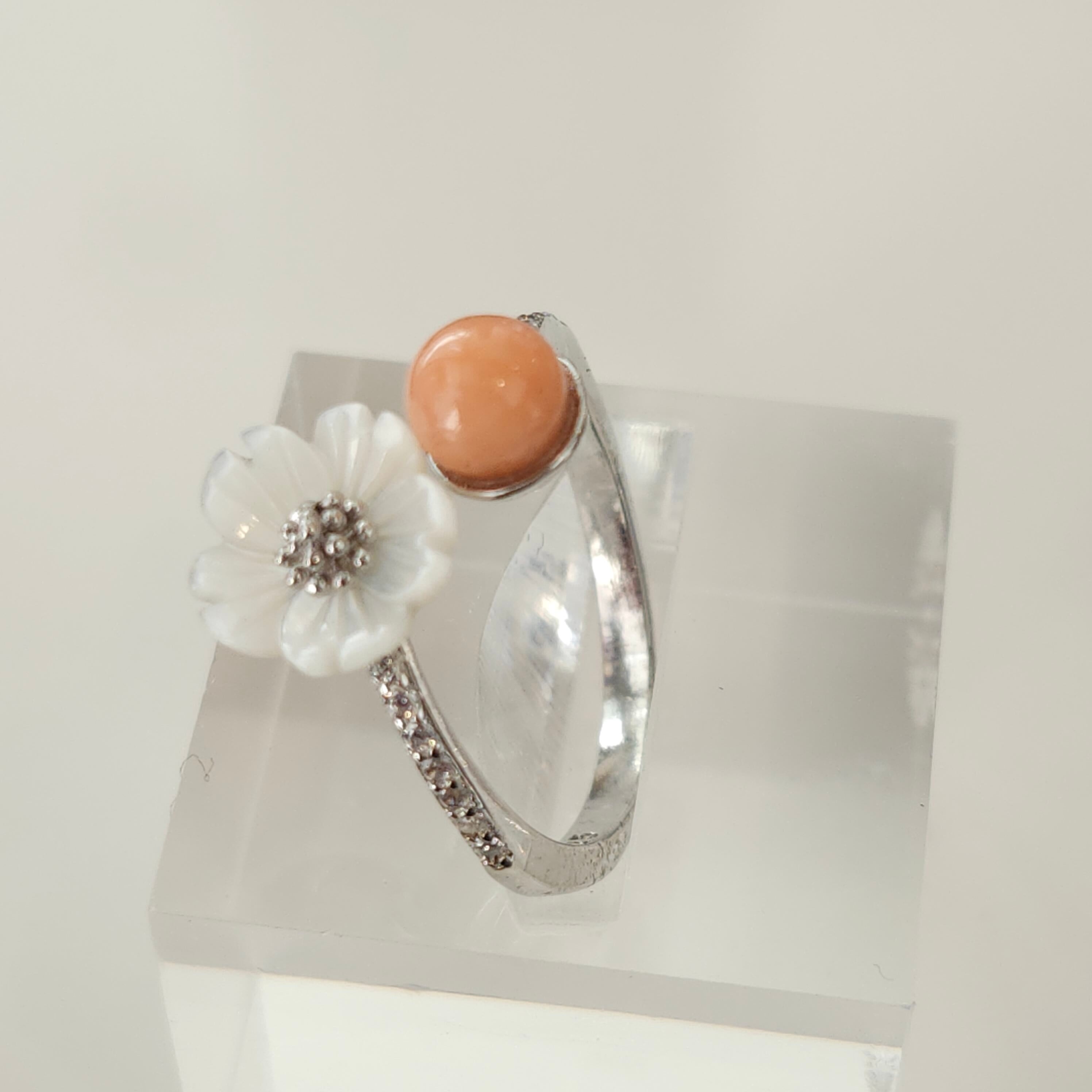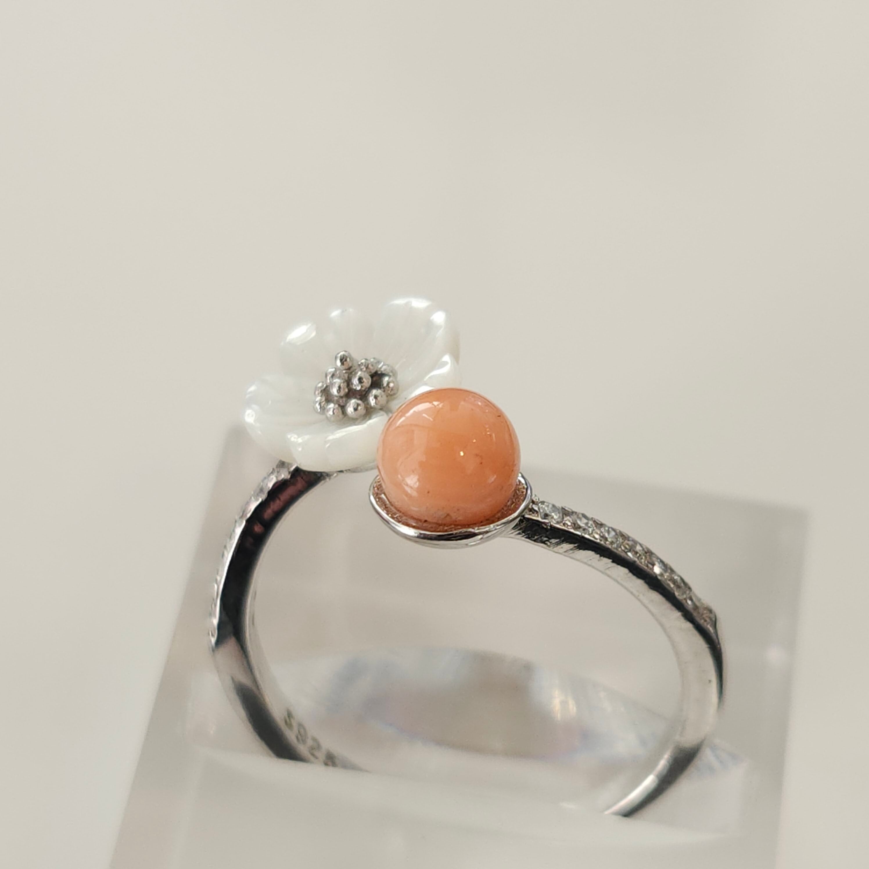 やさしいピンク色の珊瑚が目を惹くフリーサイズリングです。
