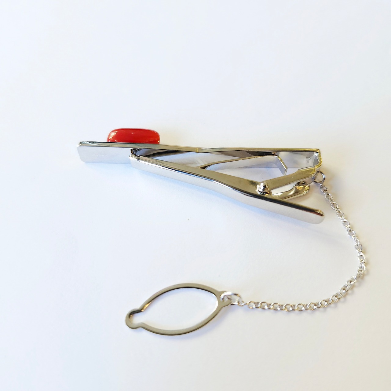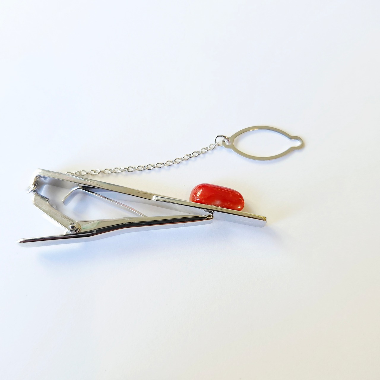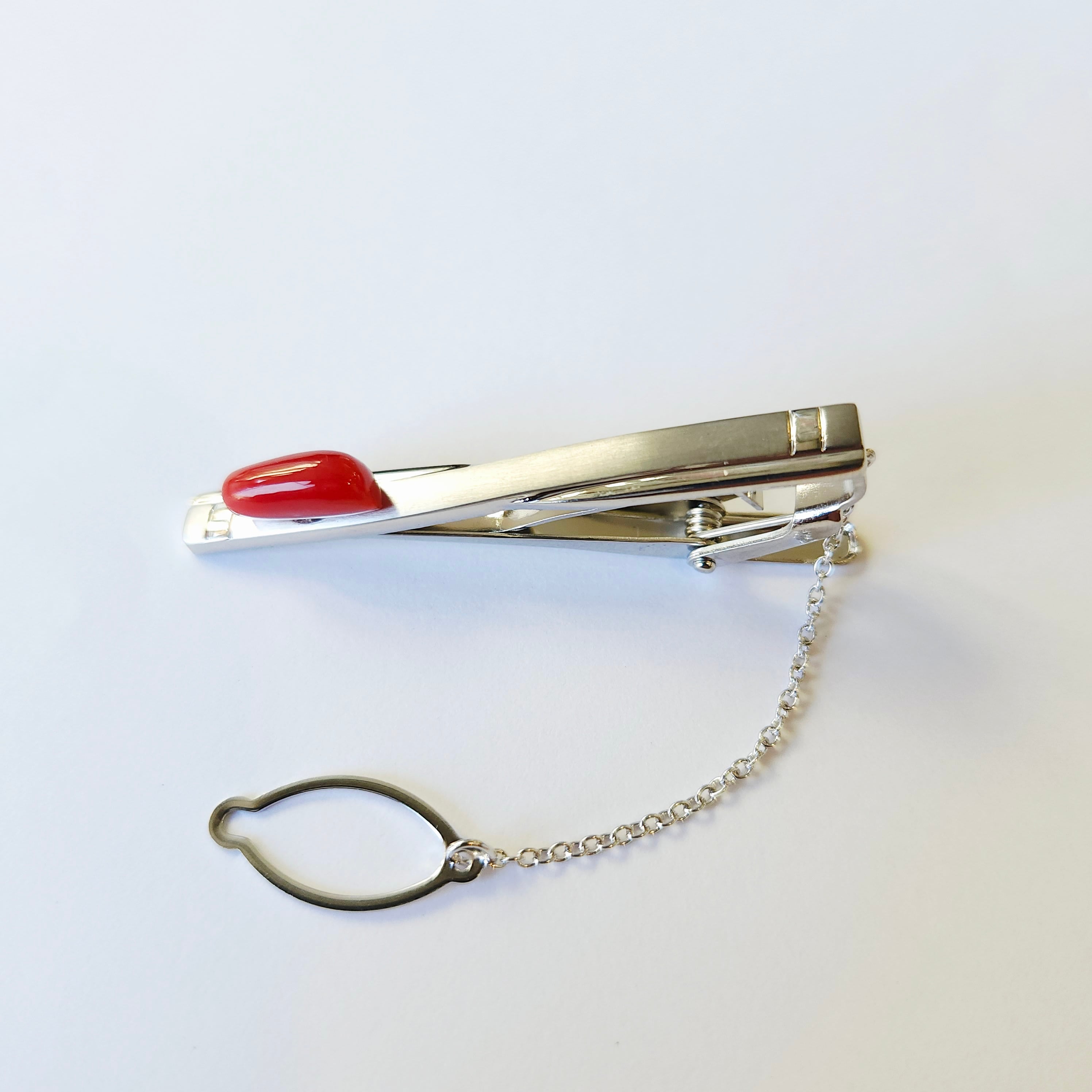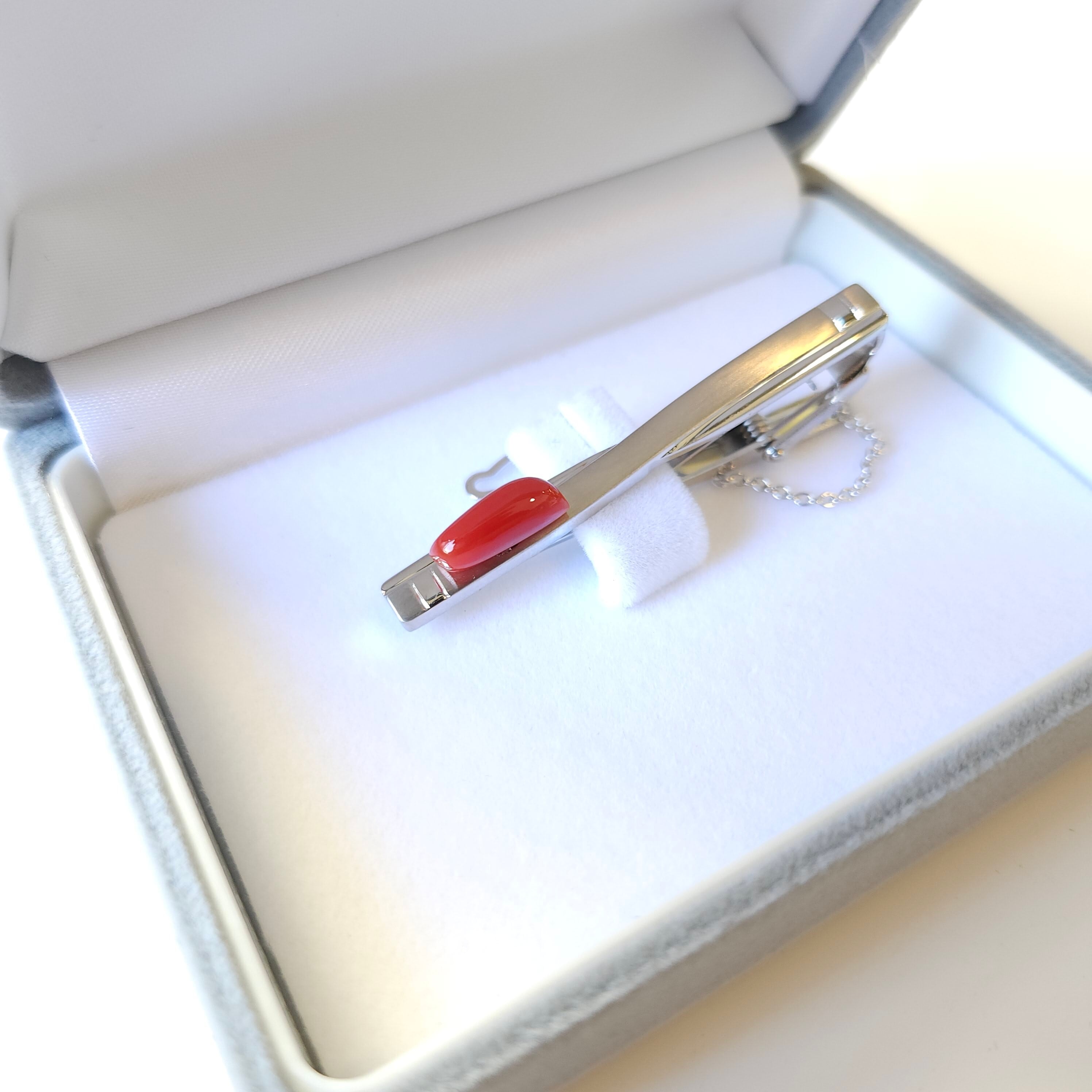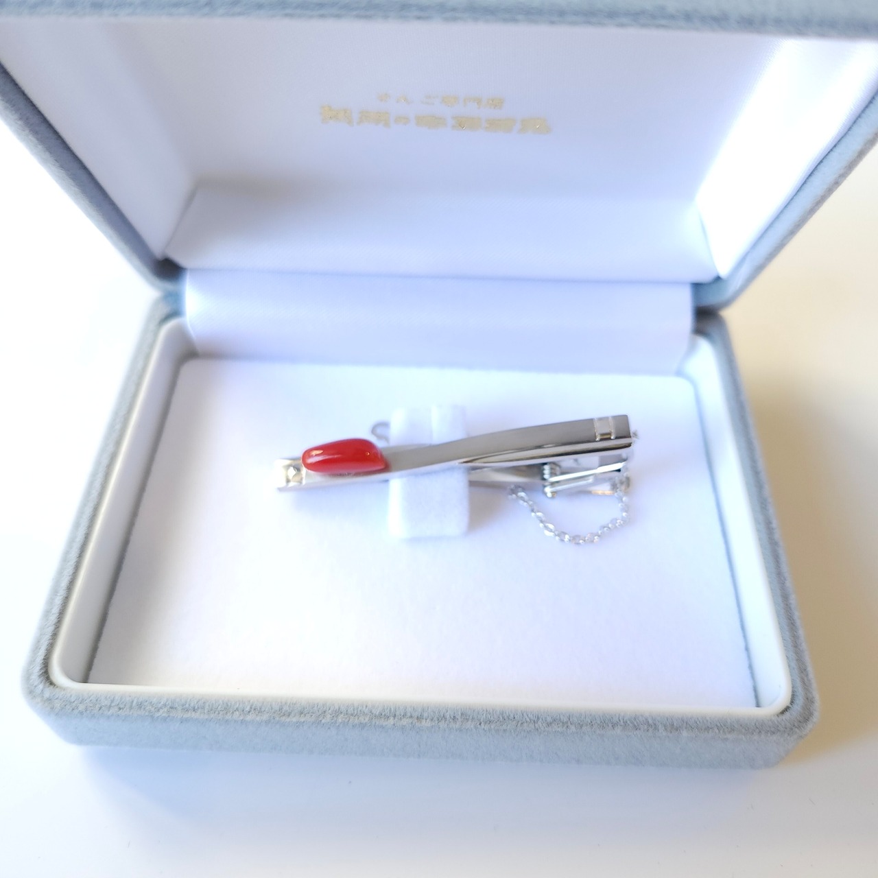 色の濃い赤珊瑚を使用し製作したネクタイドメです。