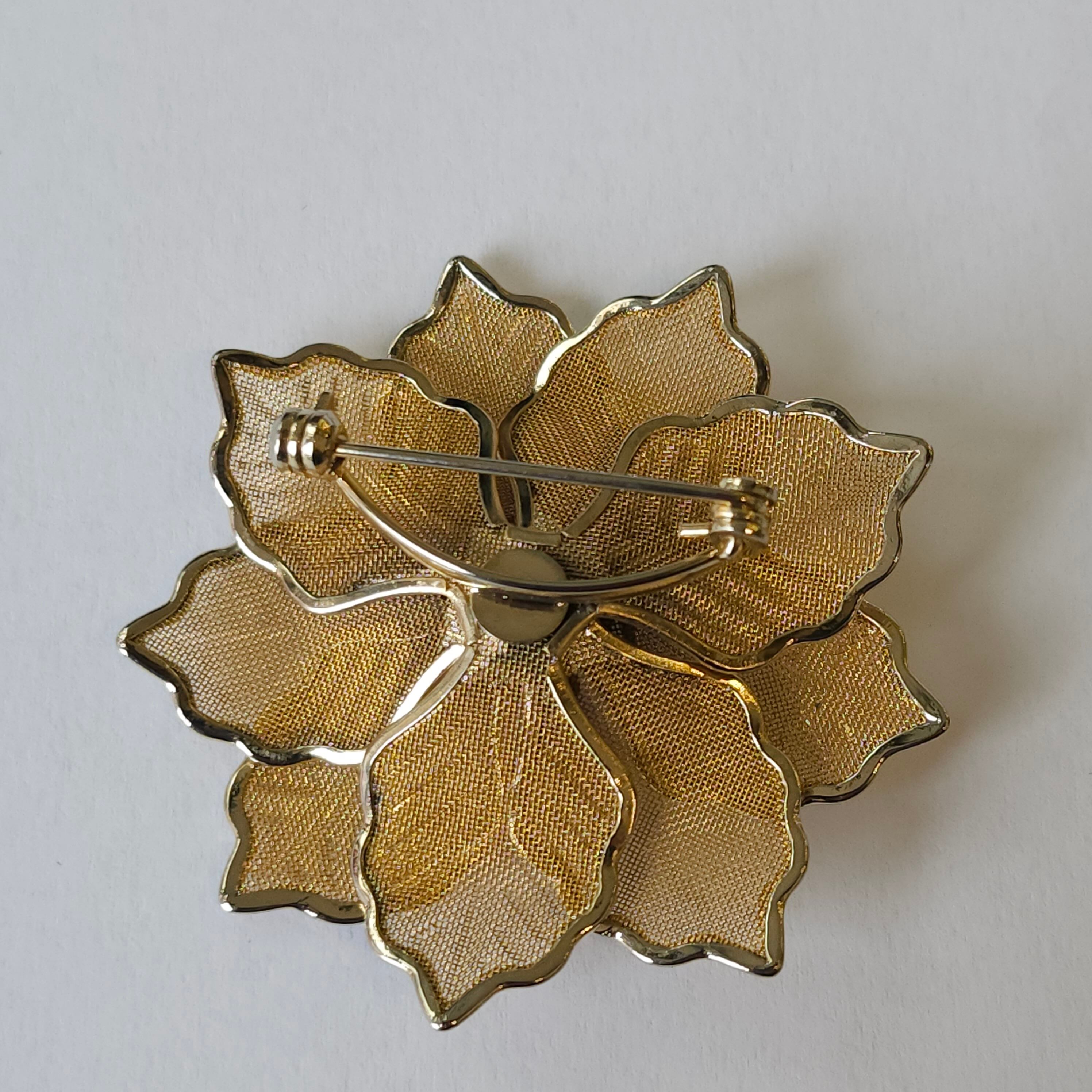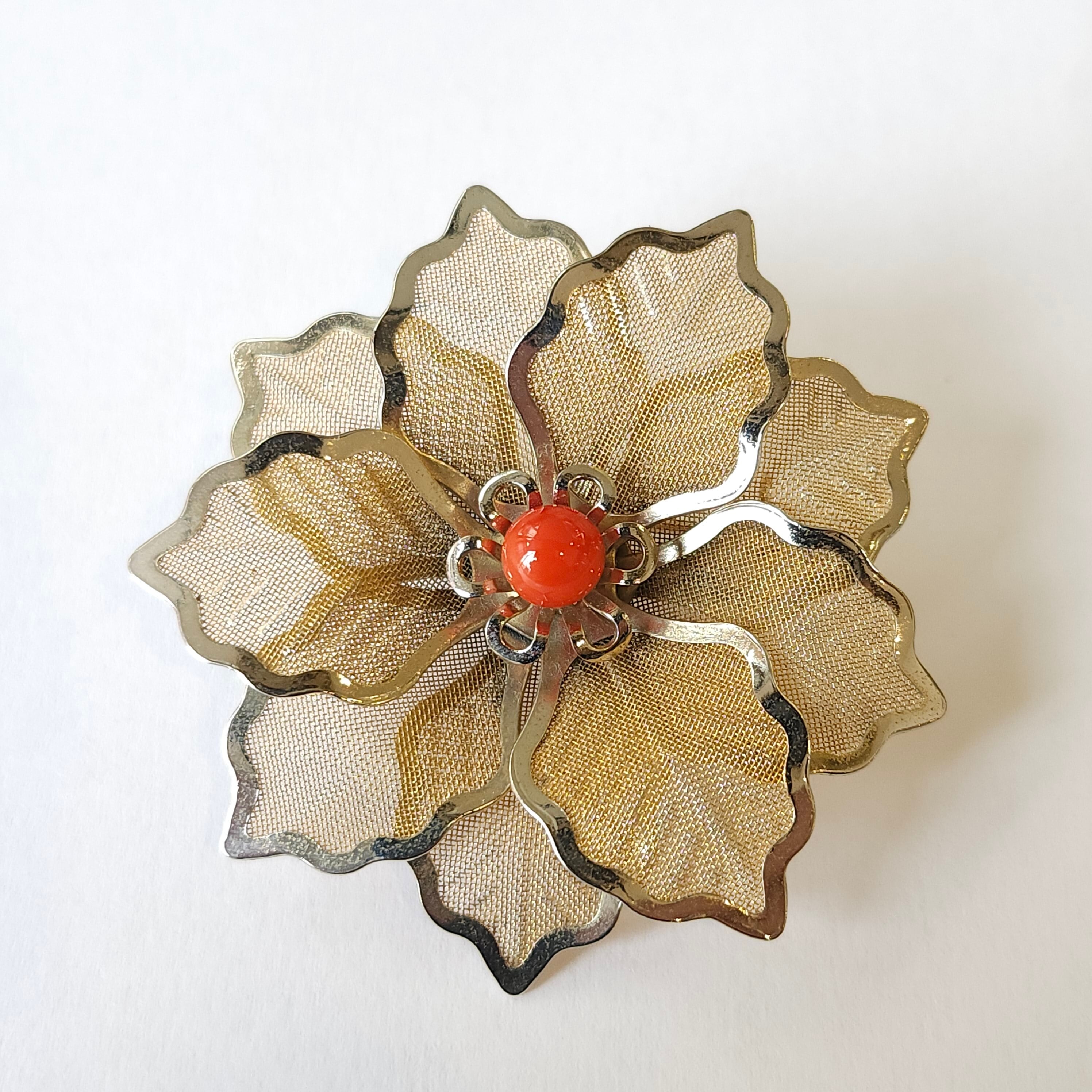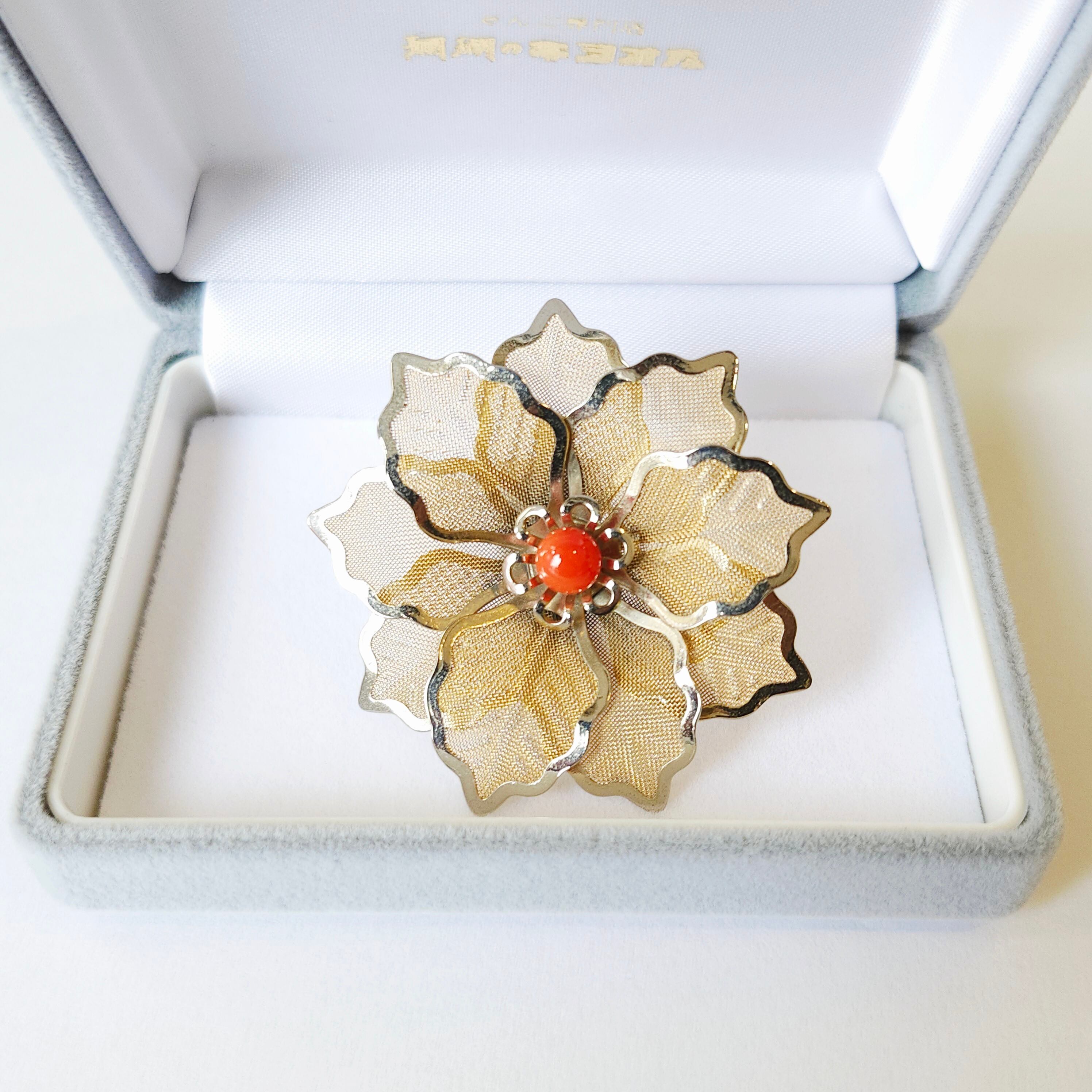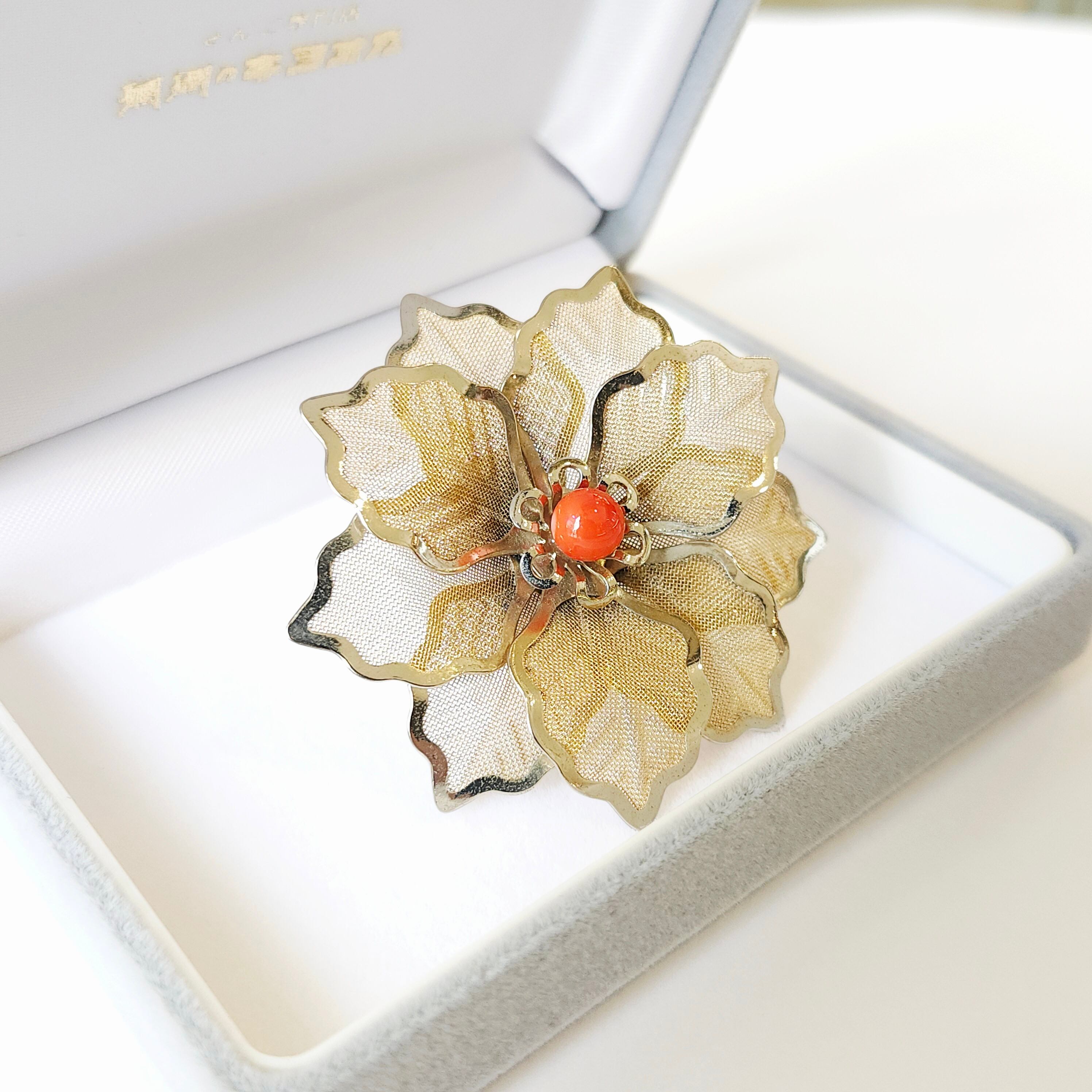金色の花の金具の中央に桃色珊瑚玉を配したブローチです。