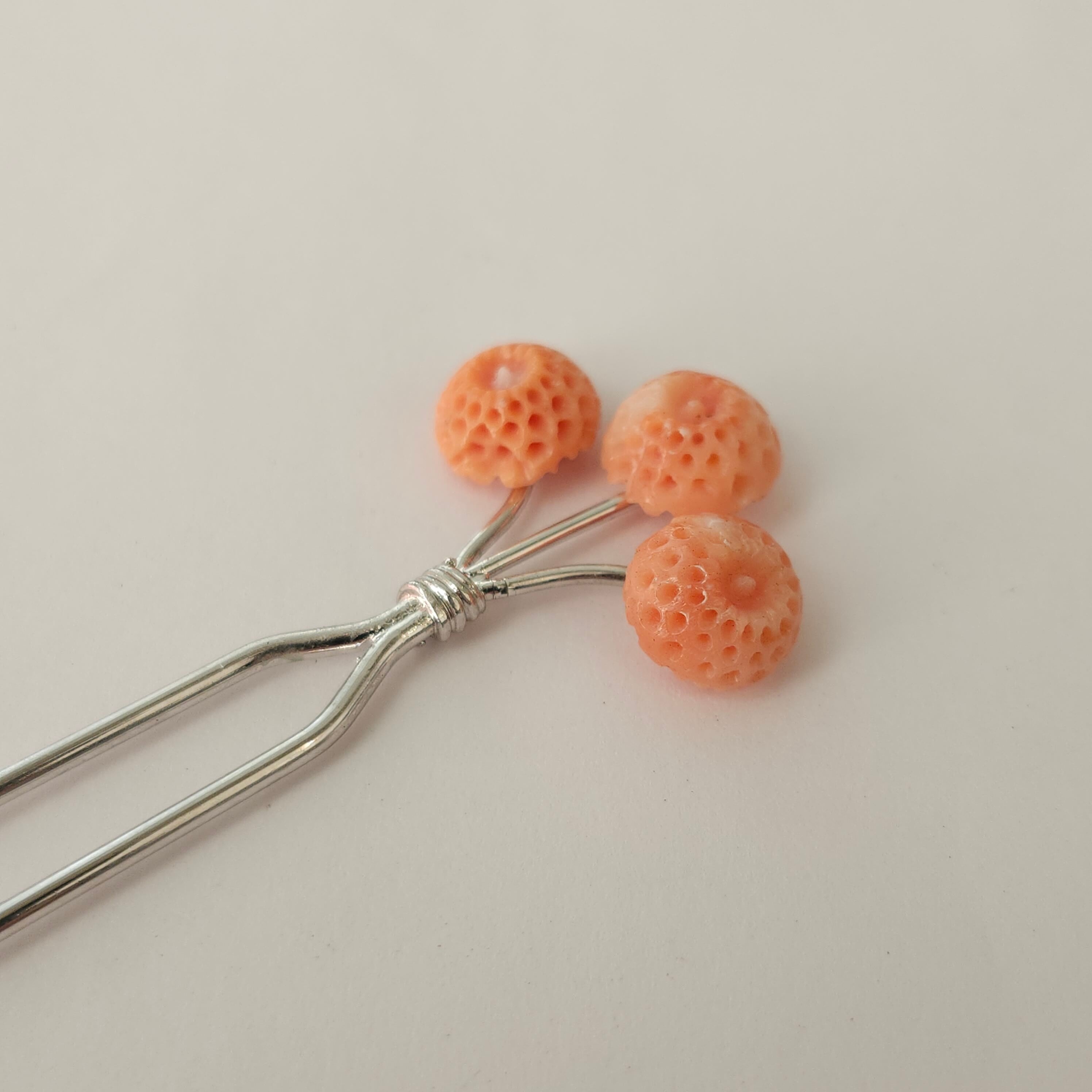 桃色珊瑚で製作した万寿菊のかんざしです。
